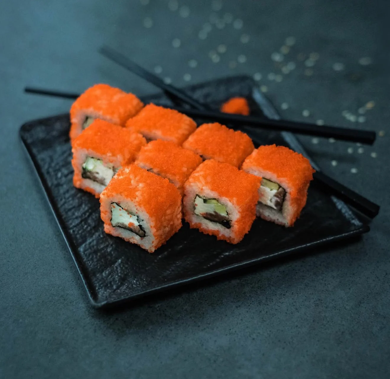 mit Lachs, fliegendem Fischrogen, Frischkäse, Gurke, Avocado, Nori, Reis, japanischer Mayonnaise