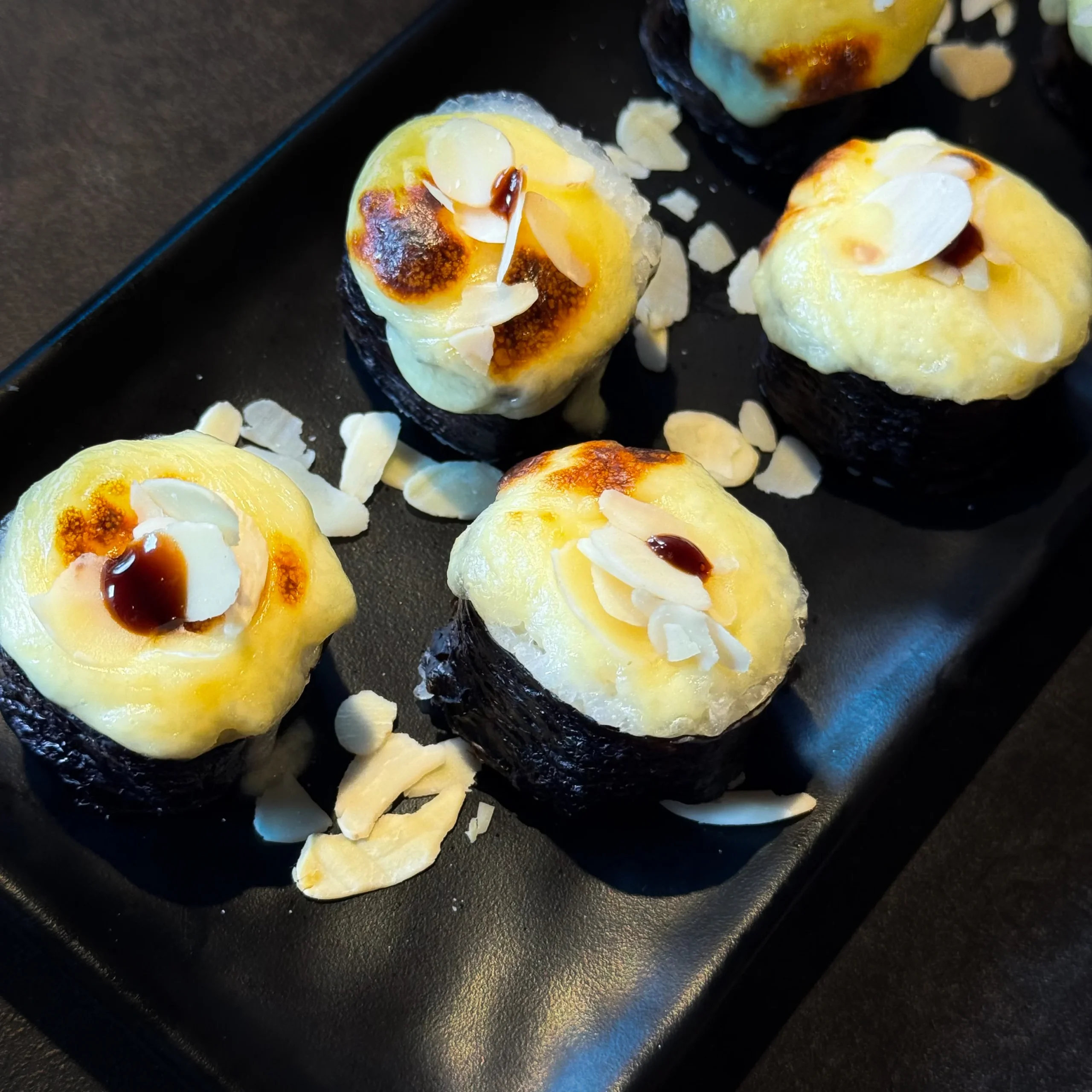 Nori, Reis, Frischkäse, gebratener Lachs, Walnüsse, Käsemix, Mandelblättchen