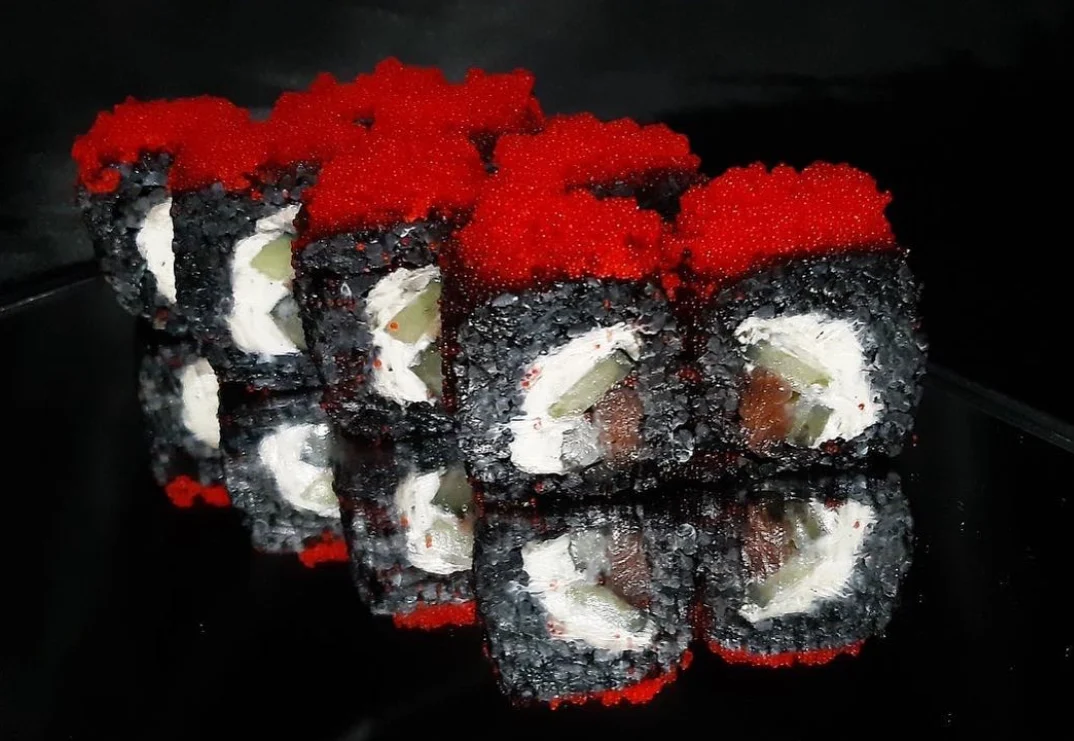mit Lachs, Gurke, Frischkäse, Tobiko, Nori, Reis mit schwarzer Tinte